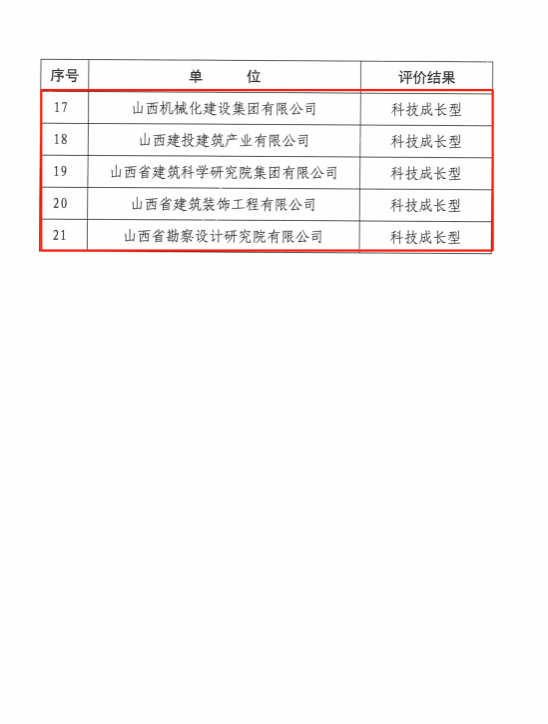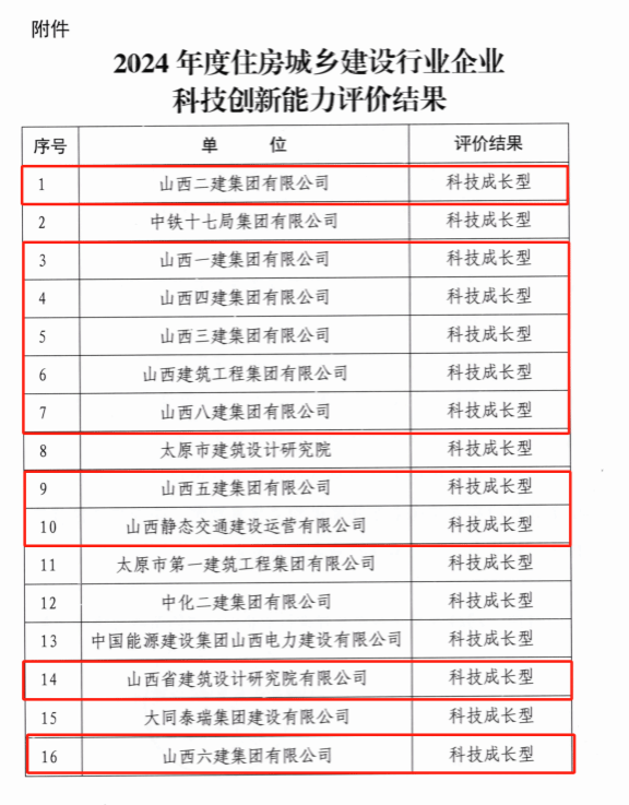 近日,山西省住房和城鄉建設廳發布了2024年度住房和城鄉建設行業企業科技創新能力評價結果。省內共21家行業企業入選,其中山西建投旗下15家企業獲評科技成長型企業。