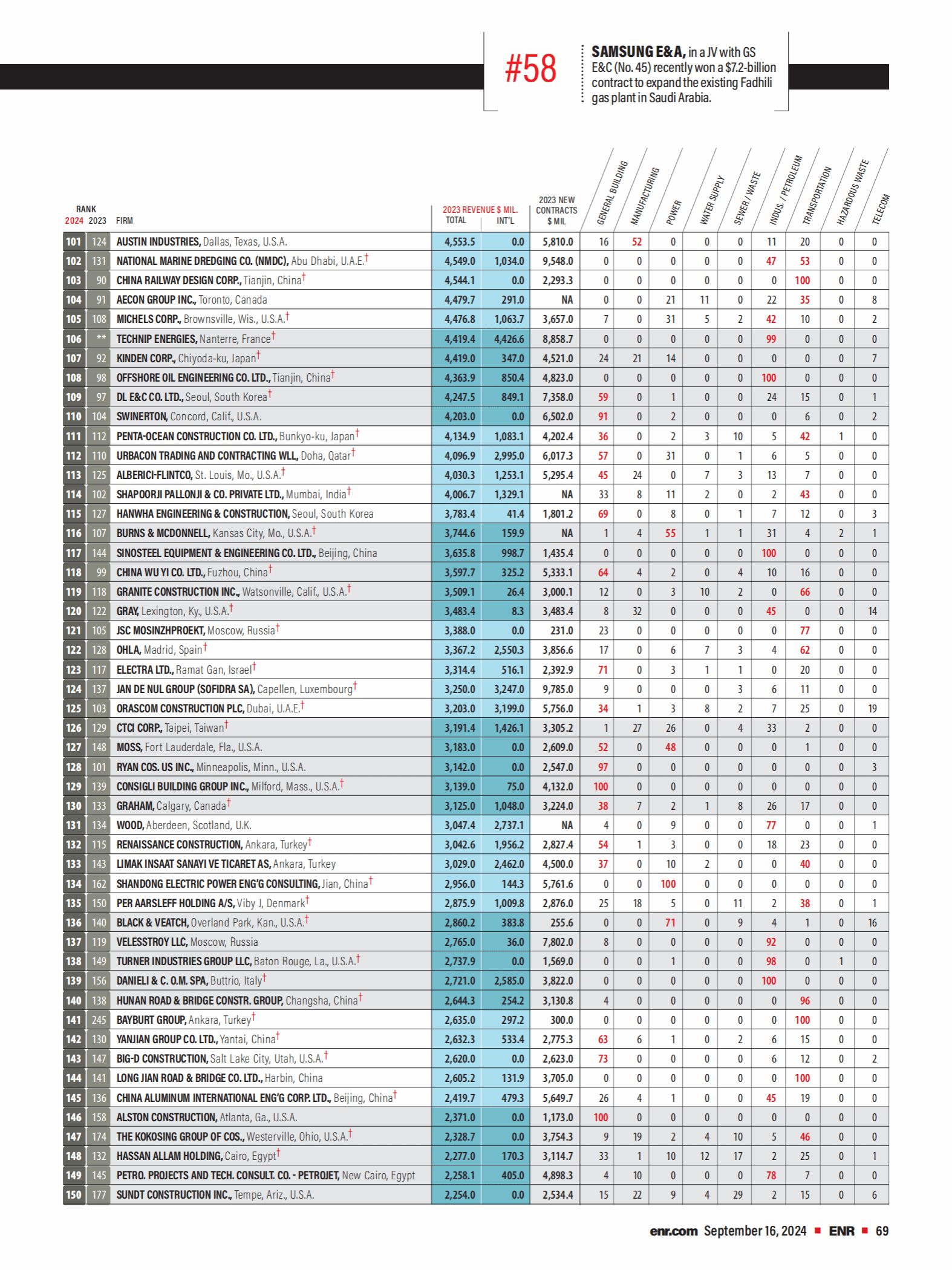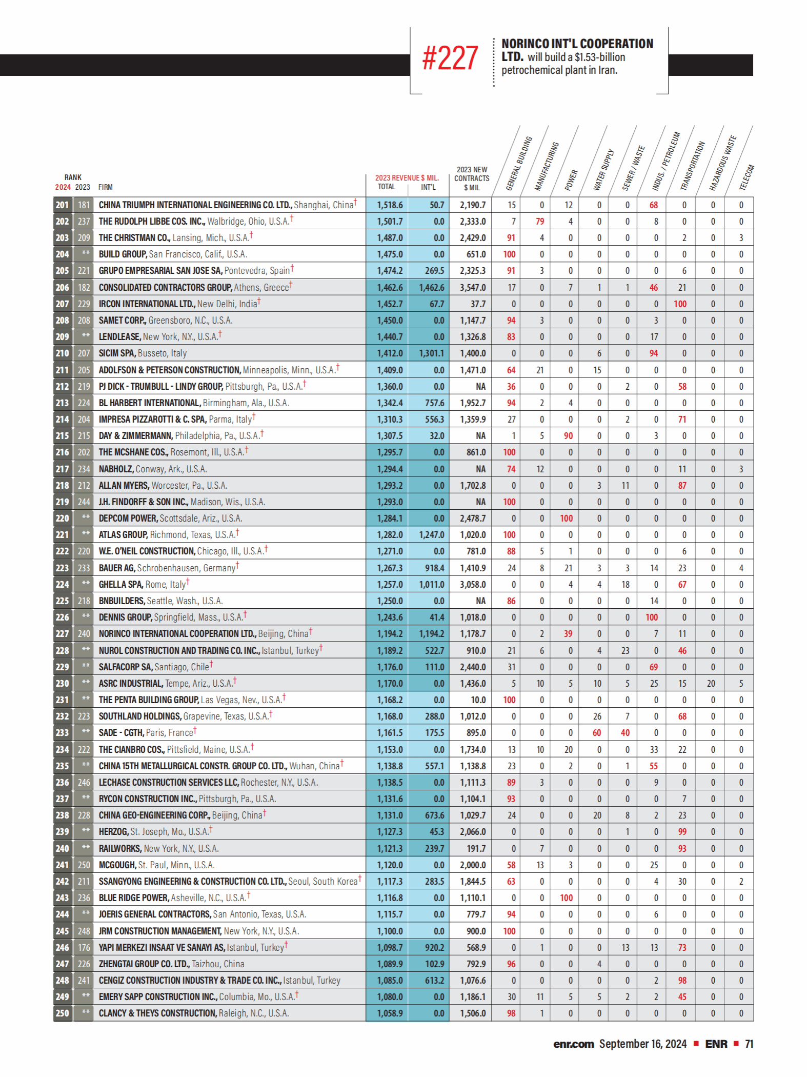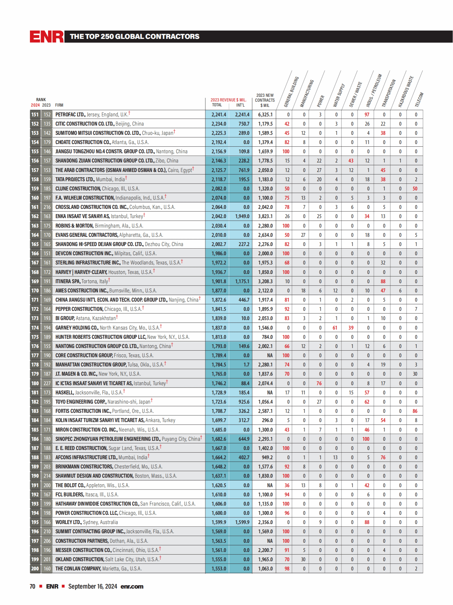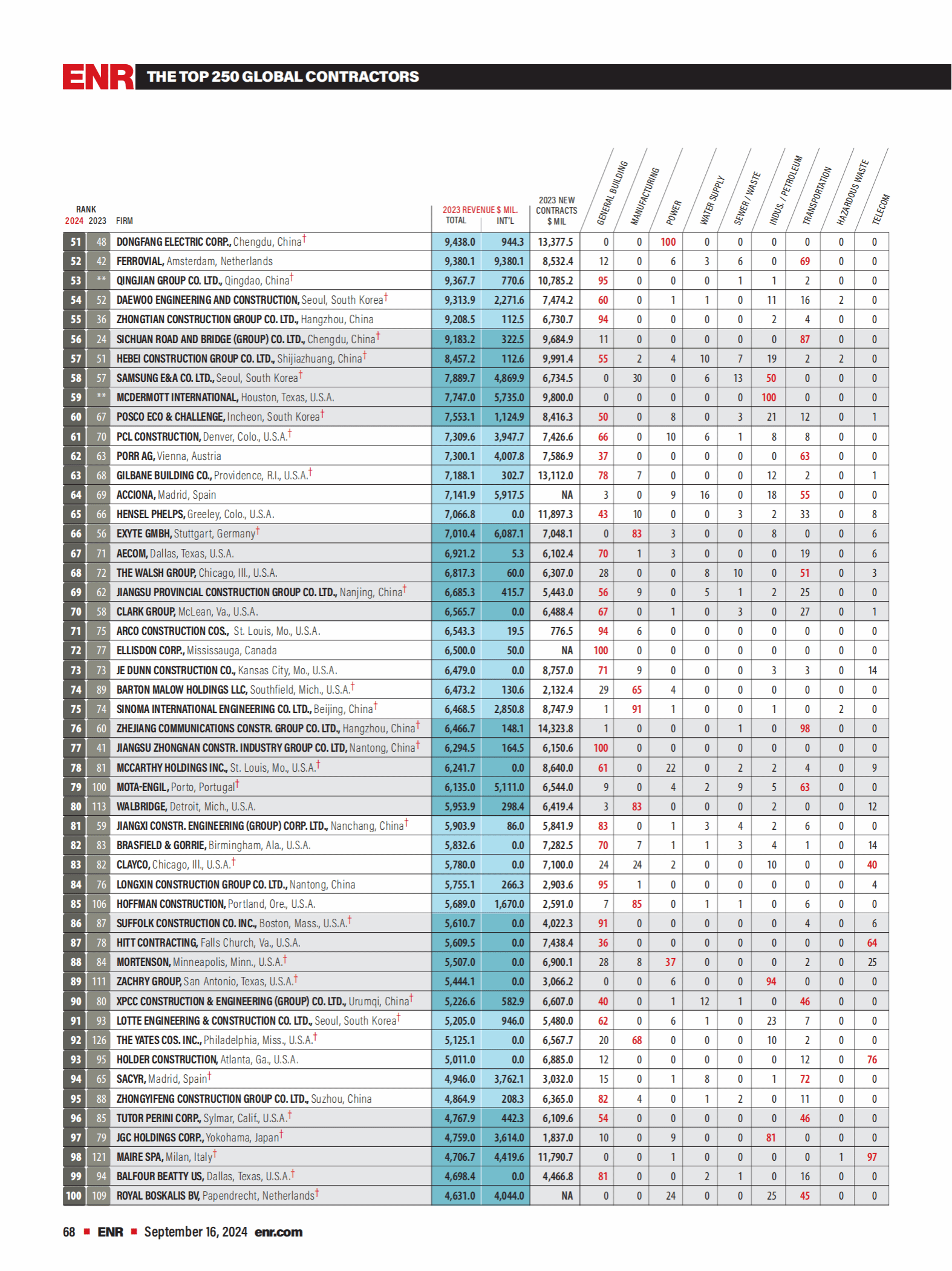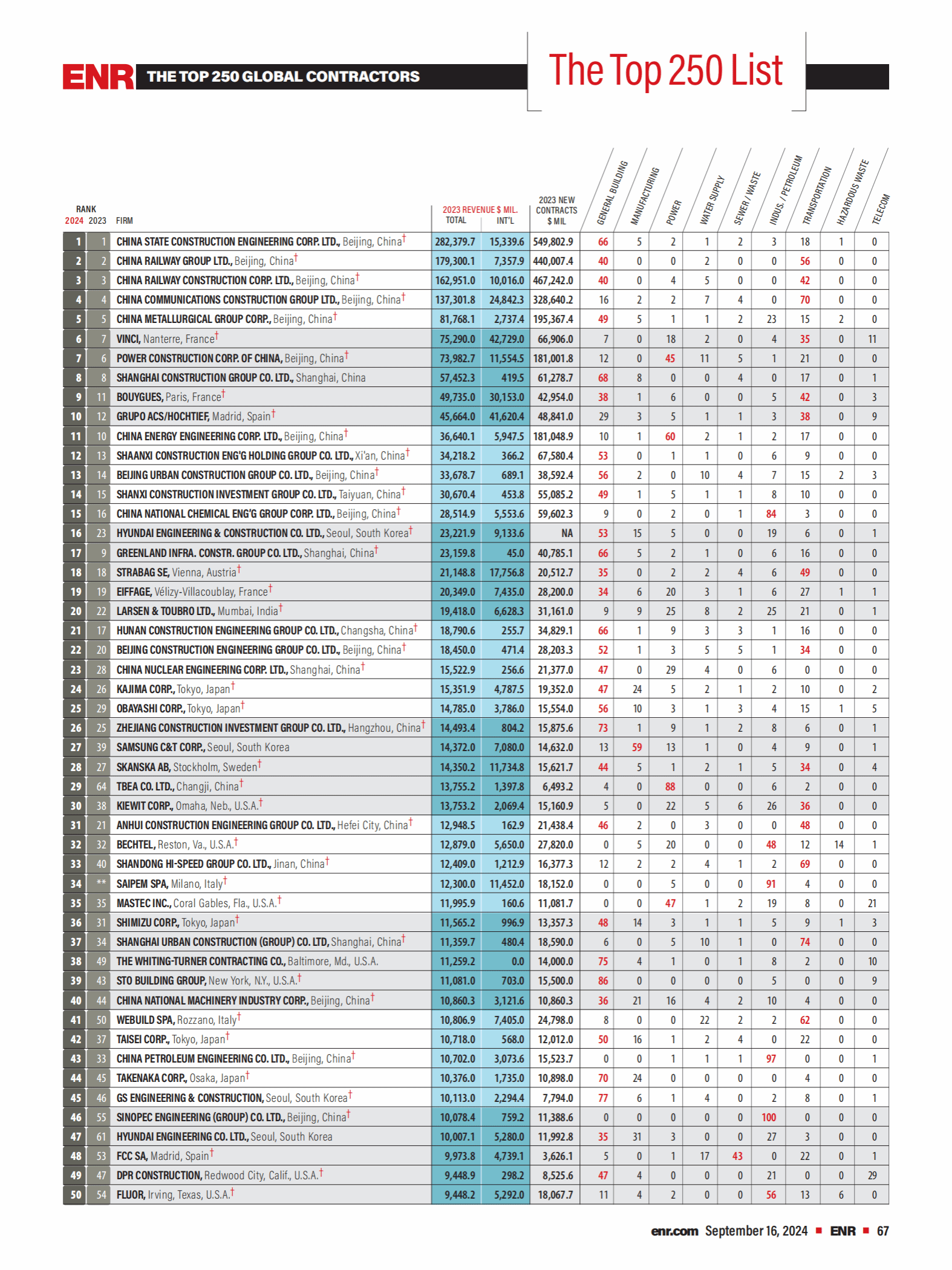 2024年度《美國工程新聞紀錄(ENR)》最大250家全球承包商完整榜單