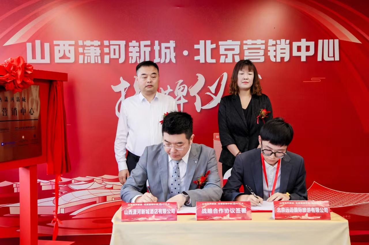 儀式上,與會嘉賓共同為山西·瀟河新城北京營銷中心揭牌,并見證山西瀟河新城酒店有限公司與北京遠邁國際旅游有限公司、中世運通(北京)國際會議展覽有限公司簽署戰略合作協議。