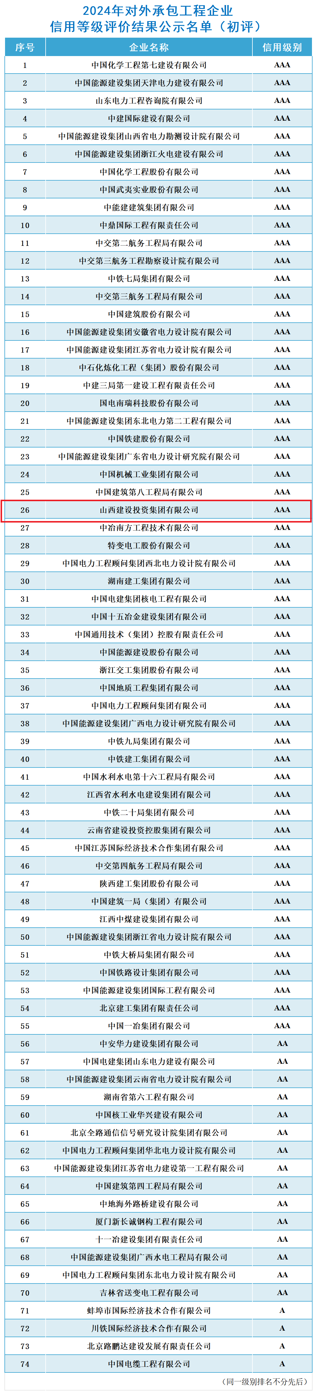 近日,2024年中國對外承包工程商會企業信用等級評價結果公布,山西建投集團順利通過對外承包工程AAA級信用企業初評(期滿重評),連續第七年被評為最高信用等級AAA級企業。
