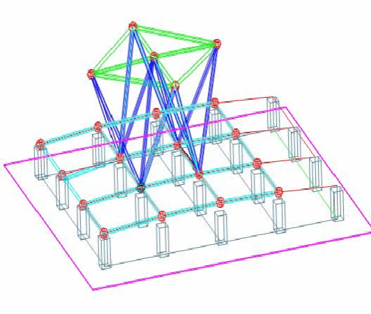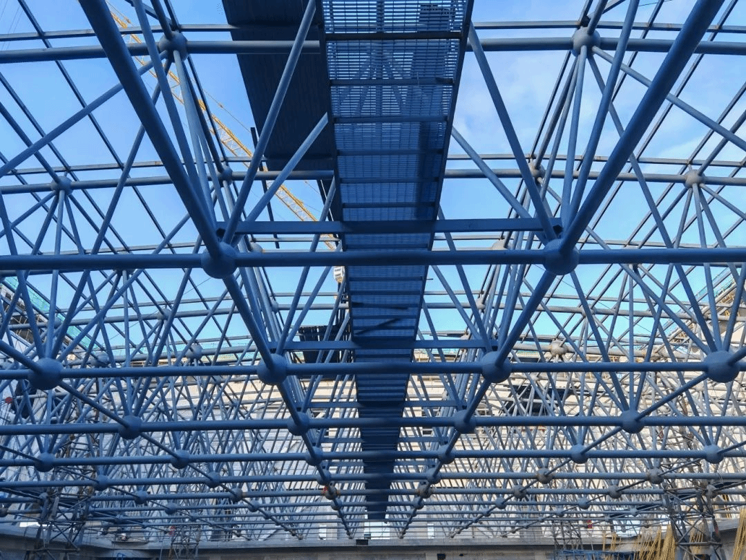 面對安裝高度高、跨度大,造型復雜,結構桿件數量多、規格各異等多重挑戰,項目團隊迎難而上,為確保頂升安裝精準度和施工安全,項目部精心策劃,采用了“地面拼裝、整體頂升、高空散裝”相結合的施工方法,利用“分段組裝、撓度控制法”從大廳中間區域起步,向四周延伸,直至整個網架安裝成型。在頂升過程中,設置8處頂升點,實時監測,同步控制,8臺大型液壓設備同步起吊,相鄰點同步誤差控制在±15毫米以內。