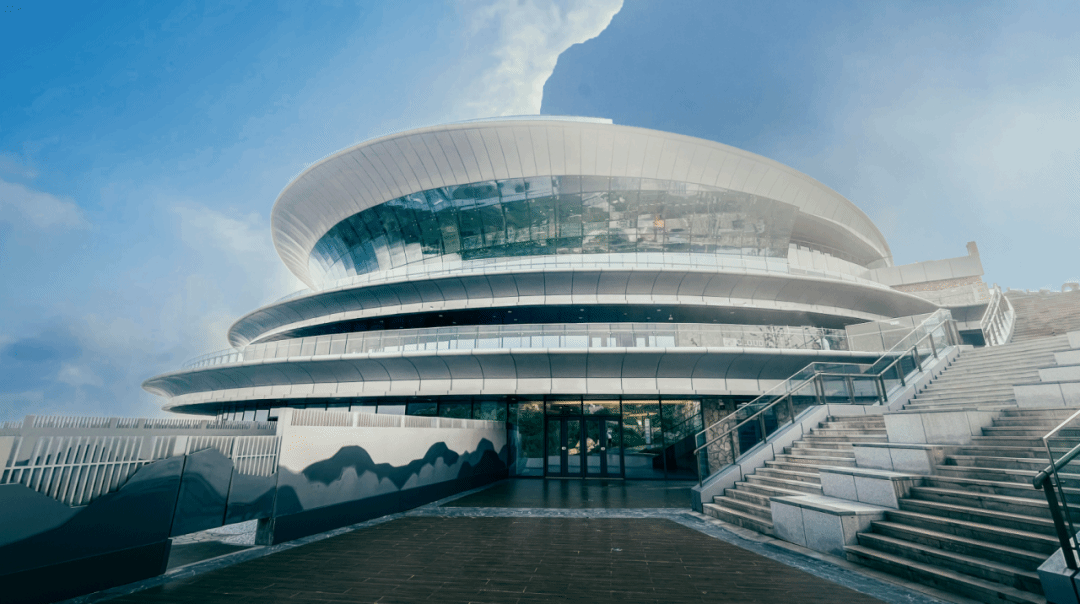“日月臺”觀光綜合體三層、四層為雙曲面玻璃,最高處8.2米,造型復雜,線條流利。云臺展示中心隨地形而建,整體形狀呈弧形,似云朵,曲線流暢美觀。幕墻與鋁板拼縫均勻,布局合理,視覺沖擊力強。