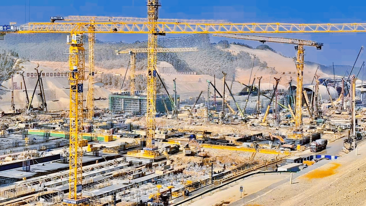 在佛山市和肇慶市交界處一片山體中的低洼狹長地帶,機械轟鳴,車輛穿梭忙碌運輸,這是廣州至湛江高速鐵路珠三角樞紐機場站前工程施工現場,7臺山西建投工程機械公司生產的塔吊正在緊張作業。此次參與項目建設的塔吊額定起重量16噸,最大工作幅度75米、最大起升高度307米,憑借其良好的起重性能和穩定表現,助力項目建設加速推進。