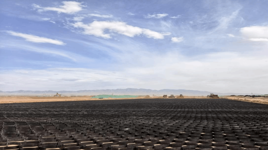 面對這一技術難題,項目團隊采用“水墜法碾壓”技術,通過科學控制注水量和碾壓遍數,快速提升沙土地基的密實度。同時,針對地質薄弱區域,采用分層換填工藝,用級配砂礫石逐步置換軟弱土層,并配合鋪設土工格柵和土工格室,形成立體加筋體系,顯著增強地基的整體性和抗變形能力,為后續道面施工搶出堅實、穩定的作業面。