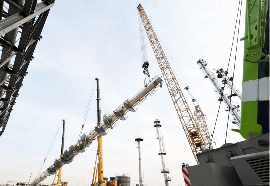 2025年3月,項(xiàng)目低溫甲醇洗裝置吸收塔吊裝就位。由于廠區(qū)布局緊湊,吊裝施工區(qū)域有限,為了順利完成高74米、起吊重量182噸的吸收塔吊裝作業(yè),項(xiàng)目團(tuán)隊(duì)反復(fù)模擬,最終采用三機(jī)抬吊的施工方案,在700噸履帶式起重機(jī)主吊,600噸、300噸兩臺(tái)汽車吊的高效協(xié)同作業(yè)下,順利實(shí)現(xiàn)“塔起燈亮”吊裝就位。標(biāo)志著項(xiàng)目大型設(shè)備吊裝任務(wù)全部完成,正式進(jìn)入設(shè)備安裝與調(diào)試階段。