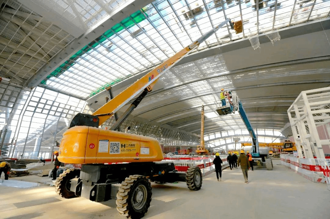 在實施雨棚燈安裝任務時,集團又遇到了新的困難和挑戰。雨棚屋面采用圓弧異型設計,站臺禁止大型機械設備進入,但普通設備根本無法完成50米高的作業任務。項目團隊急中生智,想出妙招——緊急調來100臺舉臂車,這些“鋼鐵螳螂”揮舞長臂,將作業人員舉升到空中進行作業。最終,完成了12000盞燈的安裝。