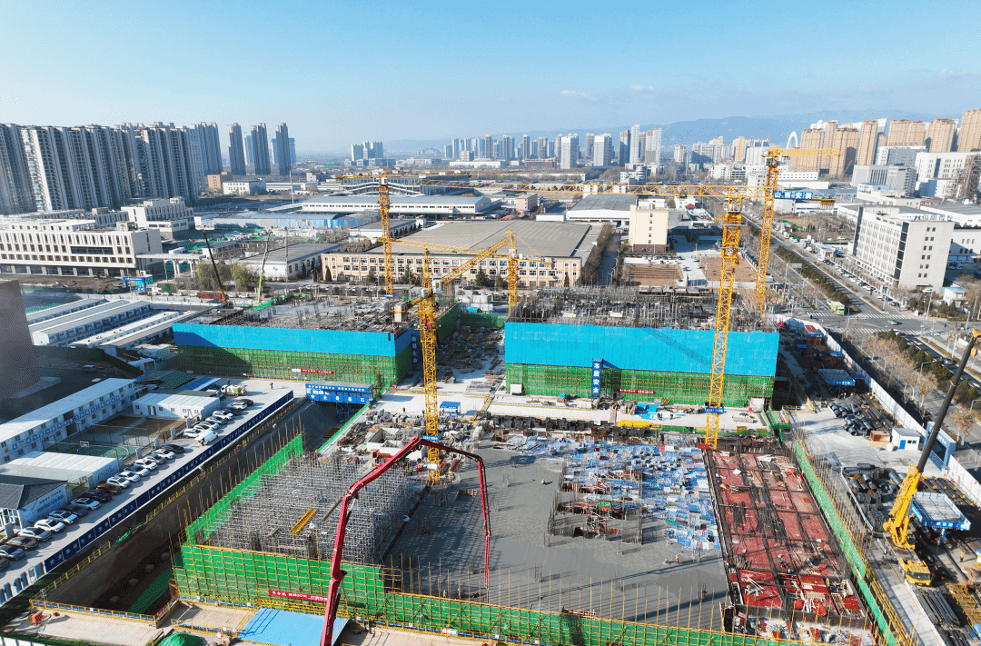 項目面臨結構復雜、工期緊張、單位含鋼量達普通建筑三倍等多重挑戰。為此,團隊將精細化理念貫穿技術攻堅全程,以技術預控和方案創新推動資源優化與效率提升。例如,在塔吊布置環節,經反復模擬驗證,將塔吊數量由3臺增至5臺,并創新采用“承臺基礎+承臺梁+防水板”與塔吊基礎一體化承載體系,既減少獨立基礎施工量,也顯著提升吊裝效率。面對高水位、高靈敏性土質,團隊運用中心島開挖法,實施分階段開挖與同步支護,結合出土量動態監控,僅用35天完成25萬方土方外運,為后續施工爭取主動。主體結構施工中,團隊進一步采用“施工段劃分+流水作業”模式,借助每日生產例會精準協調工序銜接,確保各環節有序推進。這一系列精細舉措,最終成就了“35天完成正負零、60天實現主體封頂”的安裝速度。