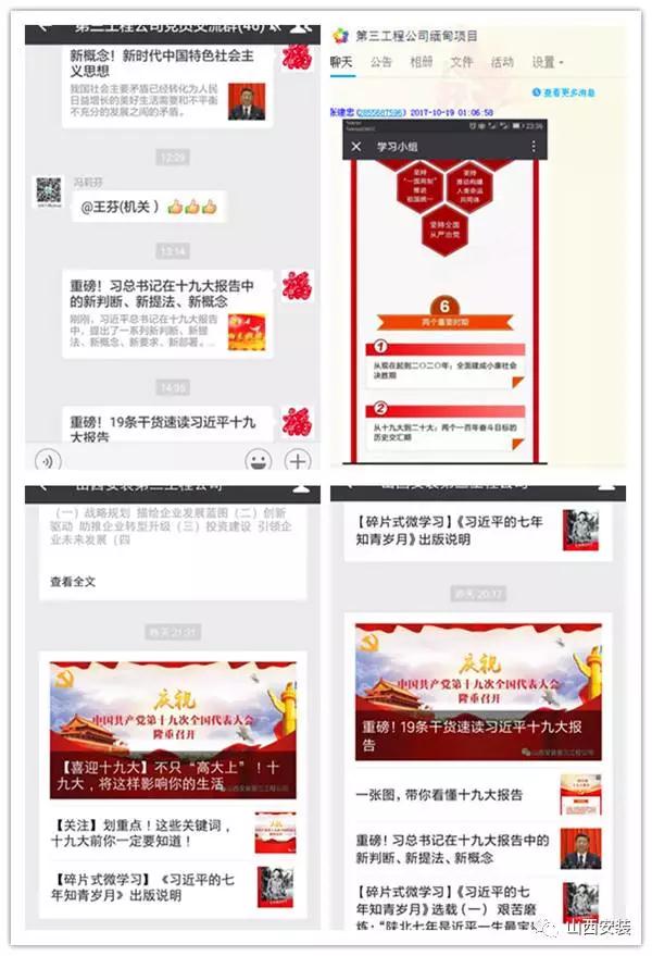 第三工程公司黨總支第一時間在自有微信公眾號、工作群等載體上宣傳學(xué)習(xí)黨的十九大精神。