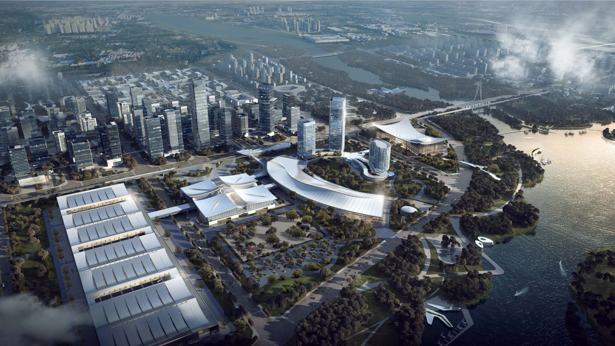 山西瀟河國際會展中心北側組團——鋼框架、矩形鋼管混凝土+下凹弧形倒三角空間鋼桁架,裝配率79%。